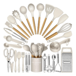 - 34PCS KITCHEN UTENSILS SET WITH HOLDER From the everyday kitchen spoons to the garlic crusher, This 34PCS kitchen utensils tools set included all the kitchen stuff you could possibly need to bring out your inner chef. This means you don’t have to spend extra money on repetitive utensil tools. This cooking utensils set includes a Slotted Spatula, Slotted Spoon, Turner, Pasta Server, Kitchen Tongs, Grater, Scissors, and so on. It is a great starter pack for a first apartment